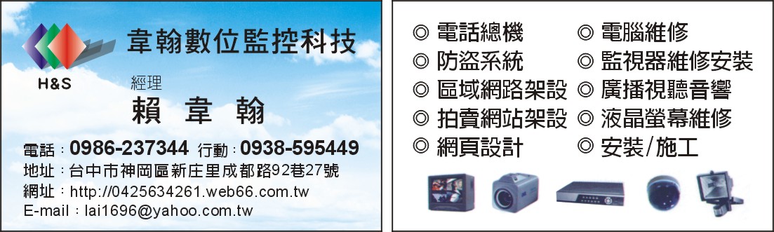 ![]() <網咖架設><網頁設計><社區網路><專案配合><規劃施工> <公司行號><社區大樓><學校單位><公家機構><個人工作室><連鎖商店><營業場所> 提供長期維護合約服務,馬上和我們服務人員聯繫;我們 韋翰資訊網路科技從事數位監視系統的規劃已有很長一段時間(專門專業數位監視系統公司,不管是監視器材販售、監視系統整合施工,對各產品都充分的了解 ,我們只專注於數位監視器材的開發、監視系統整合。擁有專業電腦及網路工程師,本身也有監視系統施工工程部人員,專業的為您服務。 若對本公司提供的服務有興趣,歡迎來電詢問,您可以透過下列方式與我們連繫,我們將竭誠為您服務。 公司:韋翰數位科技有限公司 統編:45749380 服務電話:(0986)237344(代表號) 服務傳真:(04)25634261 地址: 台中:台中市神岡區成都路92巷27號 http://0425634261.web66.com.tw E-mail:lai1696@yahoo.com.tw |